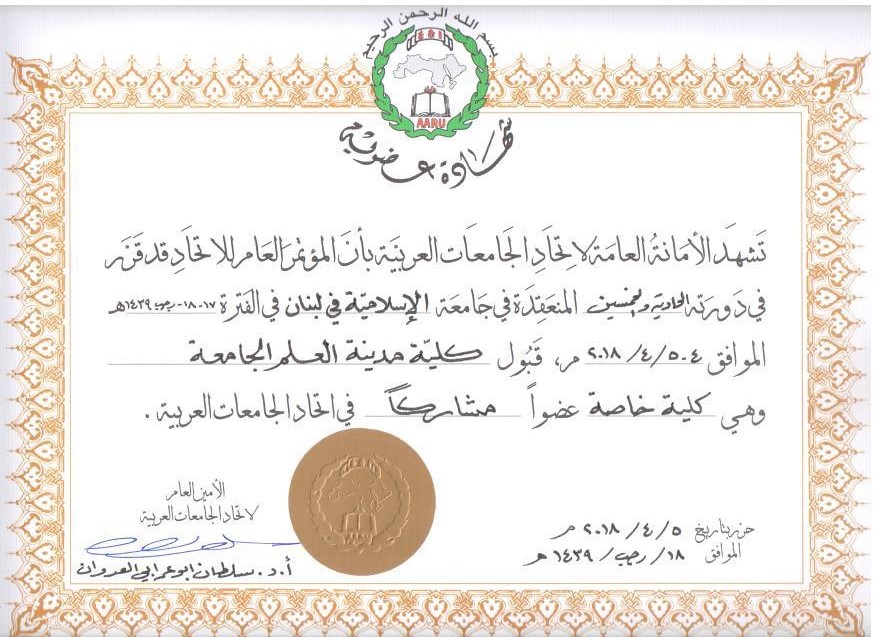 شارك السيد عميد كلية مدينة العلم الجامعة أ.د.شاكر محمود مربط في أعمال الدورة (51) للمؤتمر العام لاتحاد الجامعات العربية والذي اقيم في الجامعة الاسلامية بلبنان يوم الاربعاء الموافق 2018/4/4 وأستمر ليومين و تخلل المؤتمر عدداً من القرارات والنشاطات , ابرزها الاعلان رسمياً عن انضمام كلية مدينة العلم الجامعة الى اتحاد الجامعات العربية .