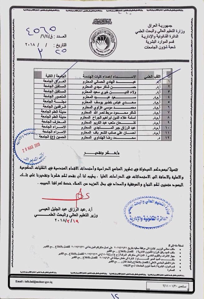 مع تمنياتنا للسيد العميد والاستاذ اسامة علاء الدين التوفيق والنجاح في بذل المزيد من العطاء خدمةً لعراقنا الحبيب