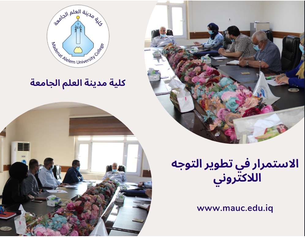 في أطار سعي كلية مدينة العلم الجامعة المستمر لتطوير طرق واساليب التعليم ولمواكبة التطور المستمر في هذا المجال اجتمع السيد العميد المحترم بحضور السيد معاون العميد للشؤون العلمية مع مدير قسم التخطيط والمتابعة ومديرة قسم التسجيل ومسؤولي الموقع الالكتروني وتكنولوجيا المعلومات والتعليم الالكتروني والتعليم المستمر المحترمون وبحث معهم سبل التطوير واستمرار الارتقاء بعمل الكلية بالاتجاه الالكتروني في كافة الجوانب.