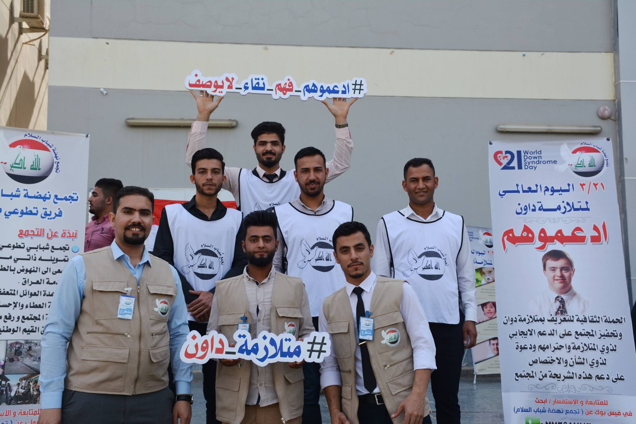 بمناسبة اليوم العالمي لمتلازمة داون اقام #تجمع_نهضة_شباب_السلام حملة #ادعموهم (جانب التثقيف والتوعية) في كلية مدينة العلم الجامعة ، وكان التفاعل والترحيب كبير بين الوسط الجامعي في الكلية حيث شاركة الطلبة والسادة التدرسين والسيد رئيس قسم القانون في الحملة واخذ صور بالهاشتك الموحد لدعم #متلازمة_داون ( #ادعموهم_فهم_نقاء_لايوصف )،